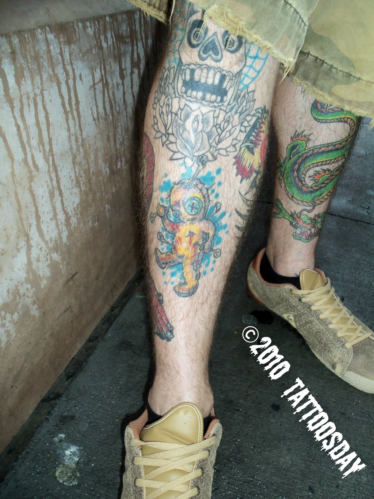 His right leg is devoted more to "Black Magic," hence the baby voodoo doll on the front of his shin.